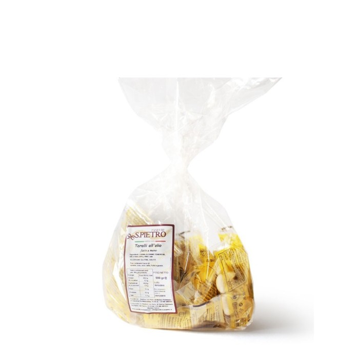 San Pietro taralli are delicious bakery products and are distinguished by their fragrance and irresistible consistency. Produced with high quality ingredients and different types of flour, enriched with aromas and spices, made following the ancient recipes of the Apulia Tradition.
